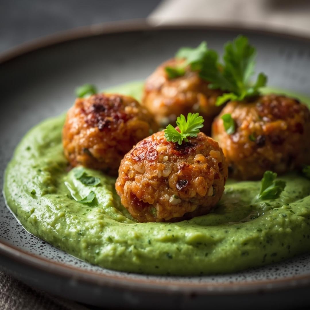 Almôndegas feitas com cenoura ralada e quinoa, servidas com puré de brócolos cremoso.
