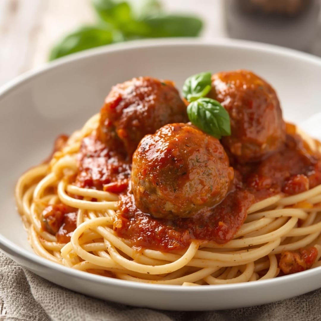 Almôndegas macias e suculentas servidas com esparguete e um molho rico e saboroso.