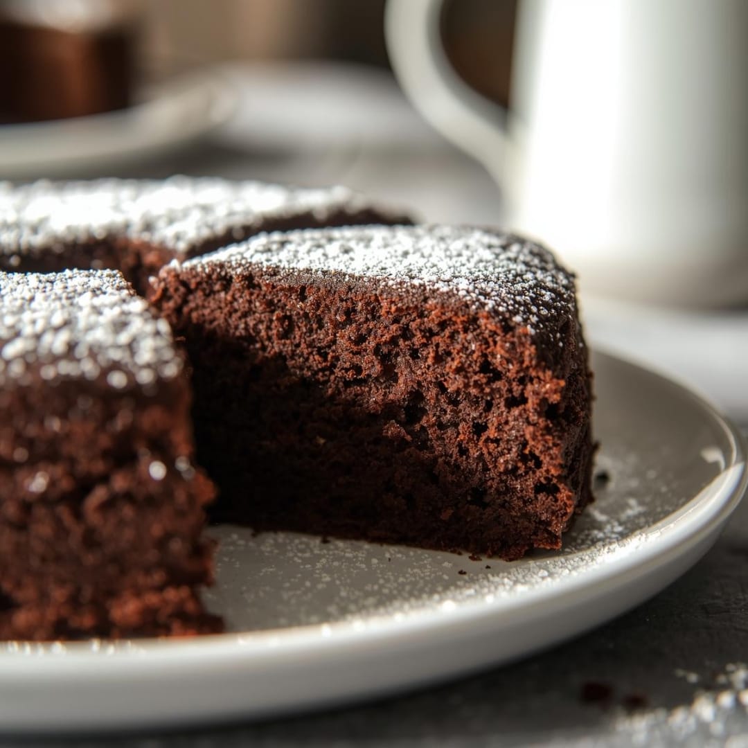 Bolo de chocolate feito sem ingredientes de origem animal, com textura fofa e sabor intenso a cacau.