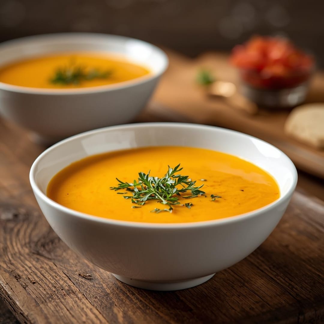 Sopa cremosa de abóbora, com textura macia e sabor delicado.