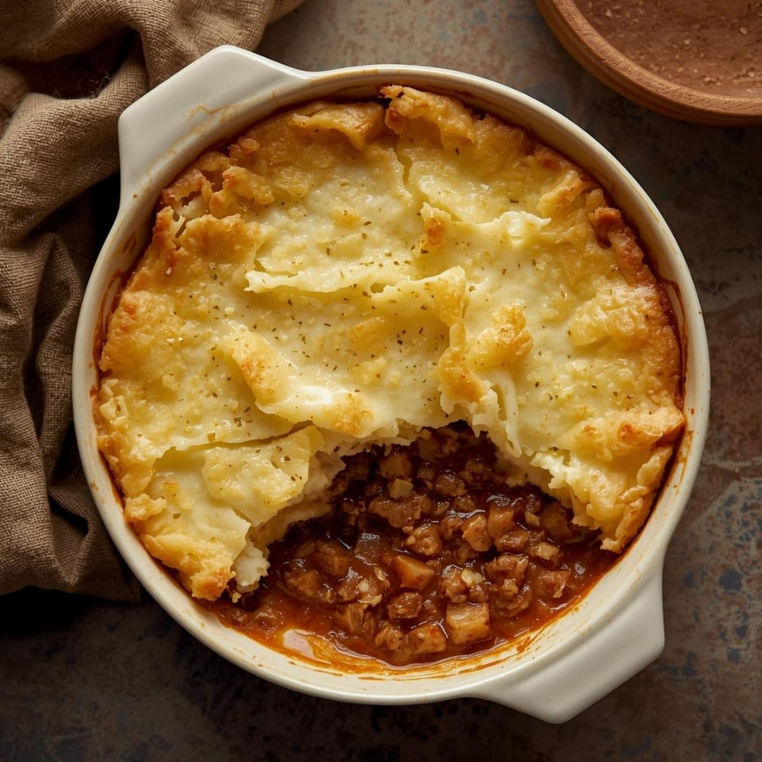 Recheio de “carne” de soja temperada, coberto com puré de batata cremoso e dourado no forno.