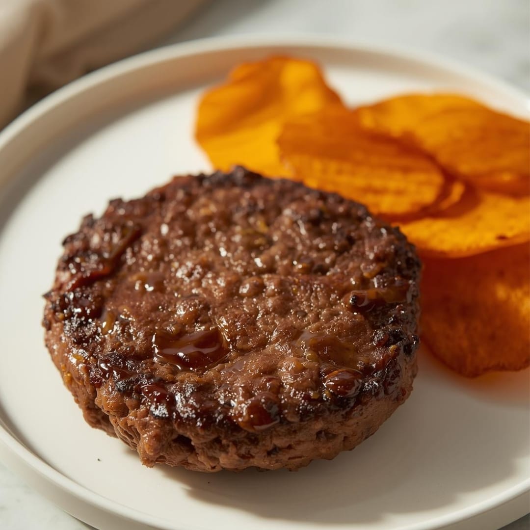 Hambúrguer de carne grelhado, servido com chips de batata doce crocantes para uma refeição cheia de sabor.