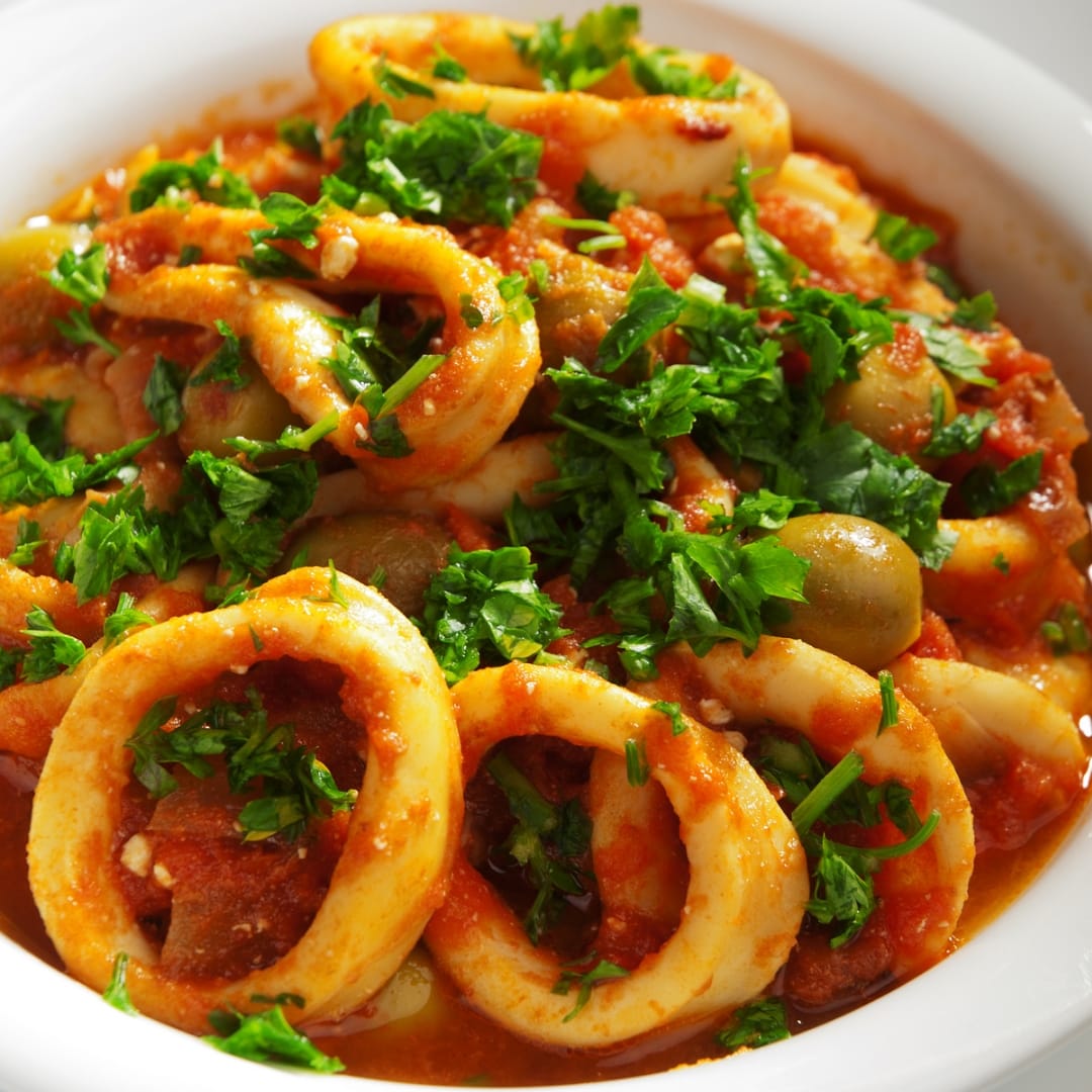 Lulas cozinhadas lentamente com batata, cenoura, ervilhas e molho aromático, criando um prato reconfortante e cheio de sabor tradicional.